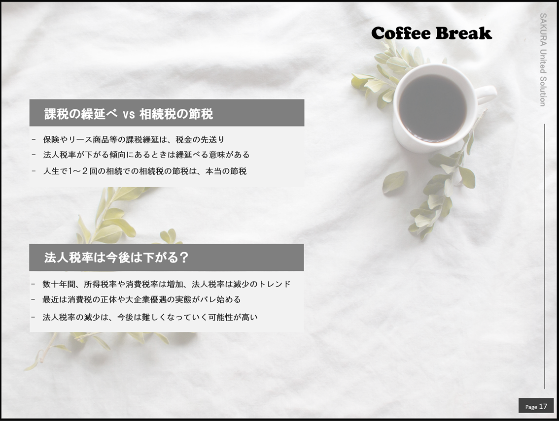 過去、日本の法人税率は下がり続ける傾向にありました。その時代であれば、税率が高い時に損金を計上し、税率が下がった時に益金として戻すことで、結果的に節税になりました。しかし、現在の税制環境では法人税率の引き下げは頭打ちとなり、むしろ増税の議論も出てきています。このような状況で安易に課税の繰り延べを行えば、将来、今より高い税率で課税されるリスクすらあるのです。